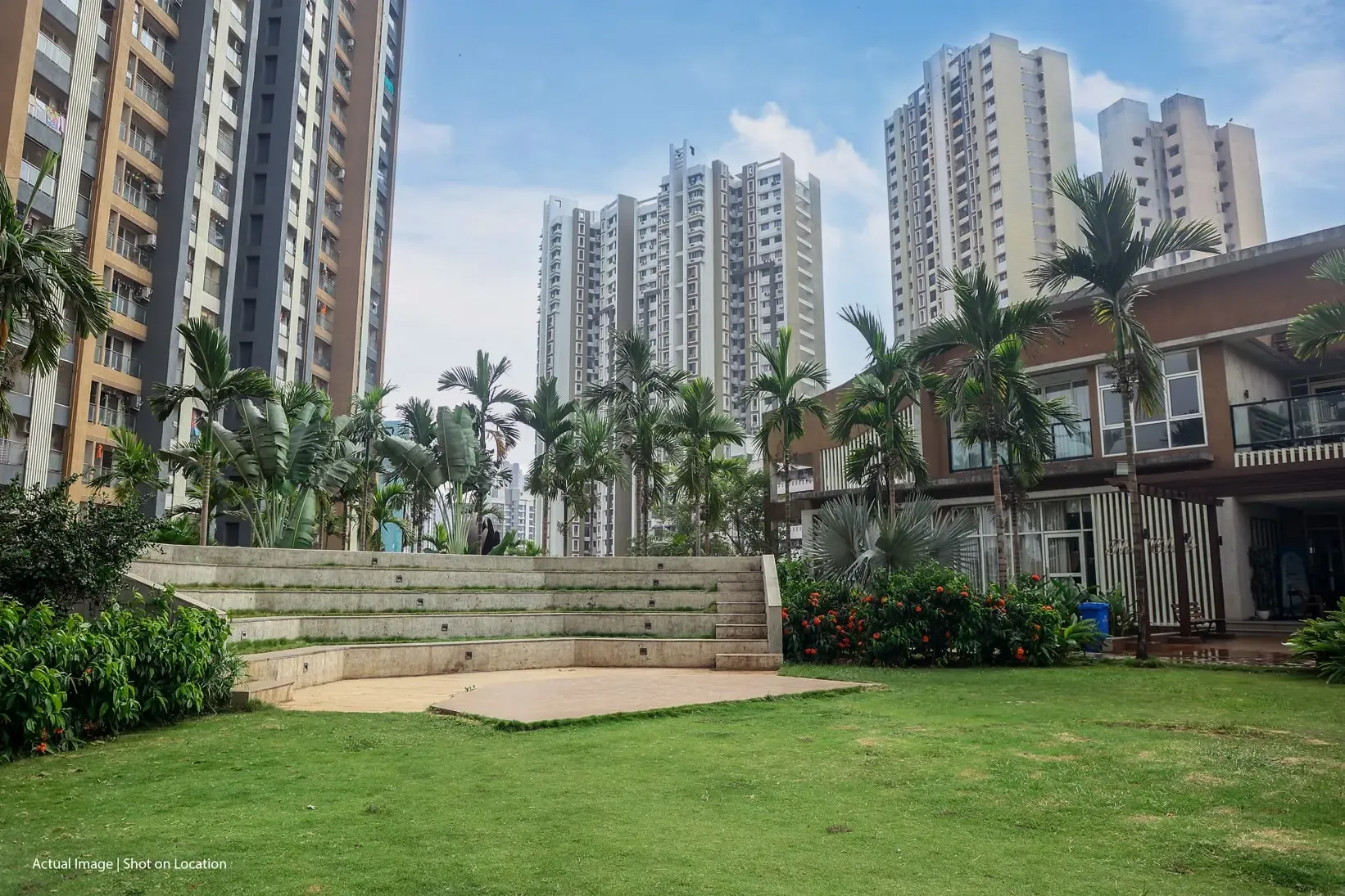 Lush landscaped gardens, swimming pool, and ample open car parking space